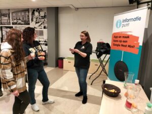 Kiyara: Ja, op de informatieavond in het voortgezet onderwijs attenderen we jongeren en hun ouders op de website Digidingen-desk. Vooral de stappenplannen zijn erg populair. Ze zijn makkelijk om uit te printen en uit te delen. Ook de kletskaarten van Digidingen-desk zijn een groot succes. Deze zorgen voor een leuk en interactief element binnen de pop-up informatiepunten. Bij de quizvragen mochten jongeren een pingpongballetje in één van drie vazen gooien om zo het juiste antwoord te geven. We hebben de kletskaarten ook gebruikt in het vo. Hierbij konden ouders en jongeren het tegen elkaar opnemen. Door gebruik te maken van de kletskaarten merk je dat leerlingen en ouders sneller naar ons toe komen om vragen te stellen.