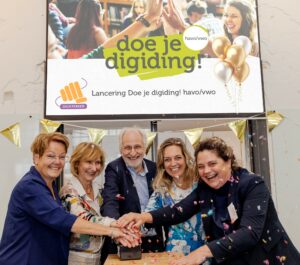 Piet Boekhoudt (Stichting Digisterker) lanceert Doe je digiding! – havo/vwo, samen met (van links naar rechts) Francis Gremmen (docent), Mary Berkhout (Netwerk Mediawijsheid), Larissa Zegveld (Kennisnet) en Barbara Kathmann (Tweede Kamer).