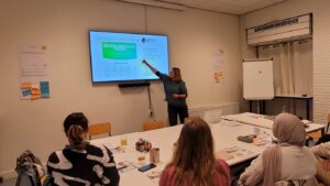 Jeltina van der Most (Adviseur jongereneducatie) verzorgt de training aan een groep deelnemers