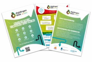 Er is een gratis toolkit beschikbaar voor professionals die jongeren ondersteunen bij hun digitale regelzaken, zoals docenten, bibliotheekmedewerkers en jongerenwerkers. In de toolkit vinden zij handige (communicatie)materialen zoals een checklist, flyer, kletskaarten, logo, poster én een voorbeeldbrief die scholen naar ouders kunnen sturen. Hiermee kunnen professionals jongeren en ouders in hun netwerk gemakkelijk wijzen op de website Digidingen-desk.